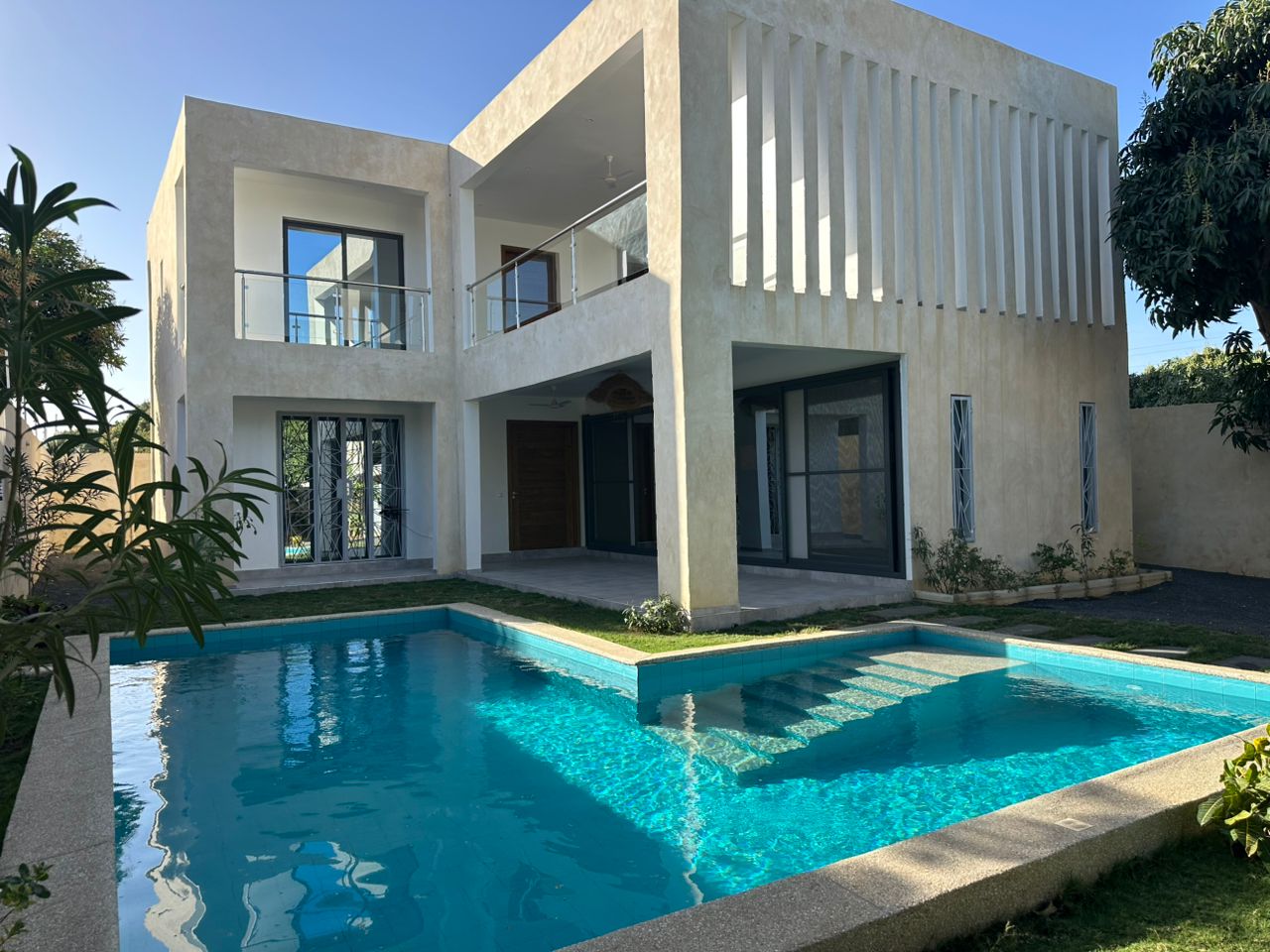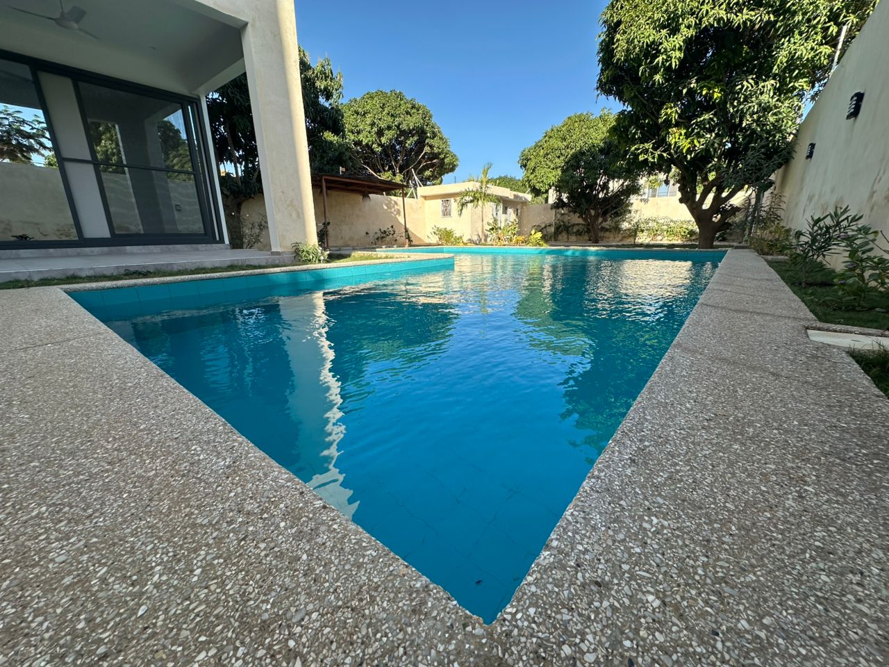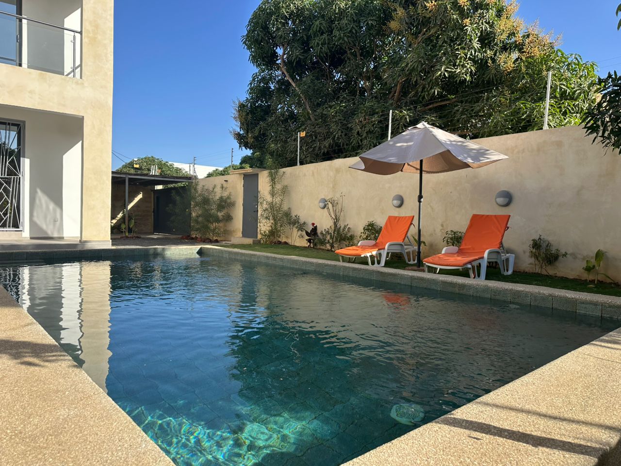 Piscine solaire en L harmonieusement alignée à la villa.